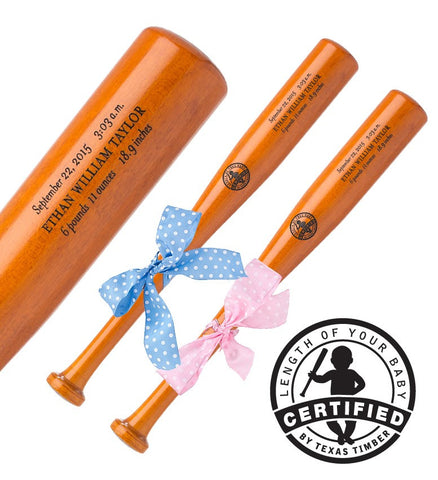 Baby Bat in Pecan - Commemorate your baby’s birth with this unique keepsake! Each bat is built to match the length of your baby at birth and then engraved with the newborn’s birth information. All baby bats are crafted from Premium Beechwood or Sugar Maple from the Catskill Mountains.